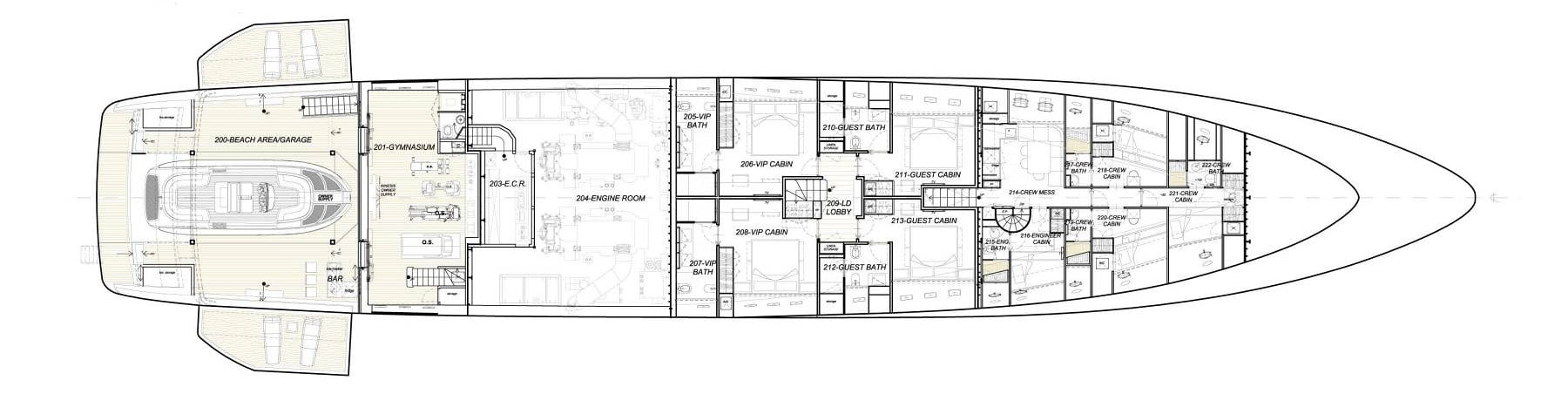 Seven Sins by Sanloranzo has a main deck swimmingpool, an 3-sided open 100m2 beach club, a fitness room with hammam and sauna and a huge bar with an outdoor kitchen on the sun deck.